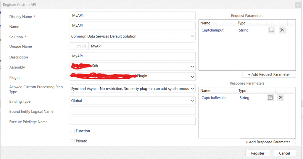 }We will assign the string “success” to the CaptchaResults output parameter of our Custom API plugin. I’ll explain this next.